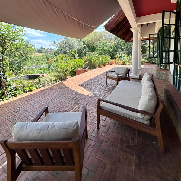 This set includes a 3-seater with two 1-seaters and a coffee table. Available in mvuli wood only. Fiber back cushion and foam for the seat. Made for outdoors: the fabric is water resistant.